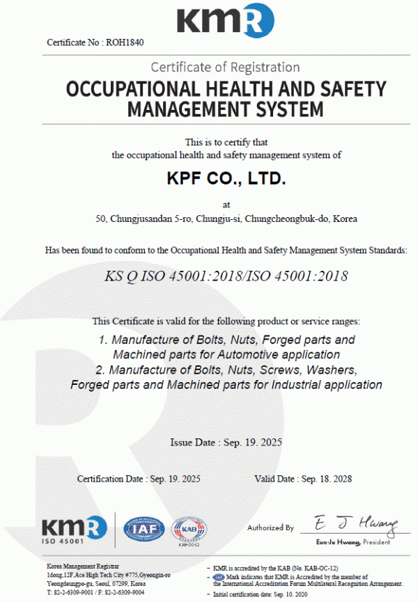 KPF has a production capability and quality level over the level of KS, and achieved KS for Hex Bolts, Hex nuts and High strength hex Bolts/Nuts/washers since 1983.