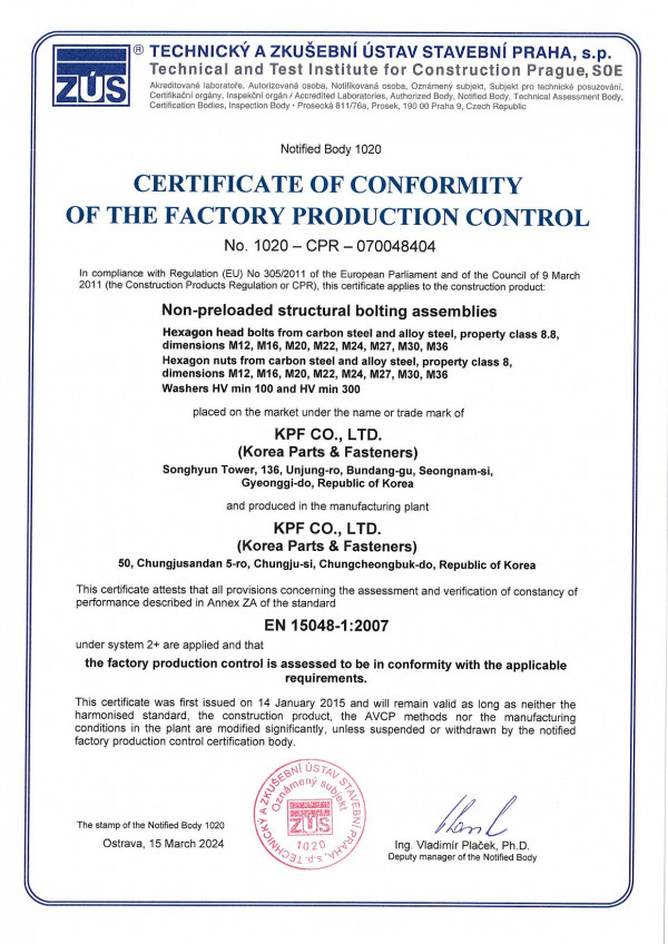KPF는 유럽 건설용 화스너 시장에 대한 점유율을 확대하기 위해 Non-preloaded bolt에 대해 규정한 국제 규격인 EN15048-1을 2015년에 취득하였습니다.
