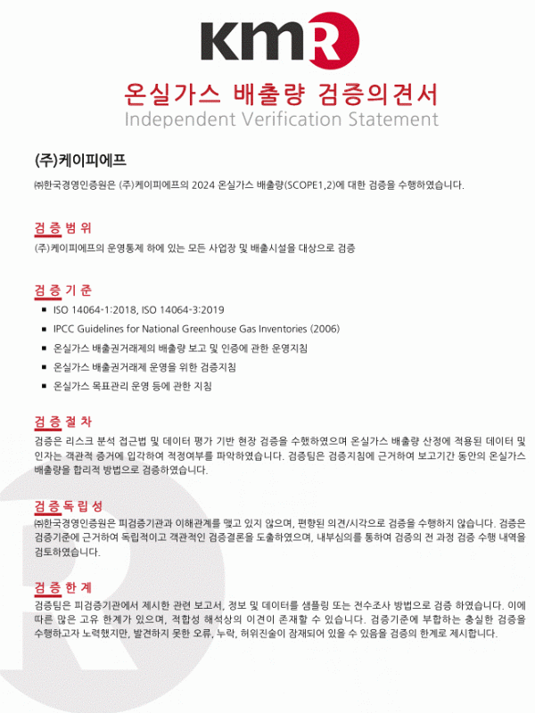 KPF는 영국 시장에 수출하는 금속제품의 검사성적서 종류에 대해 규정한 국제 규격인 EN 10204 Type 3.1에 대한 인증을 2022년에 획득하였습니다.