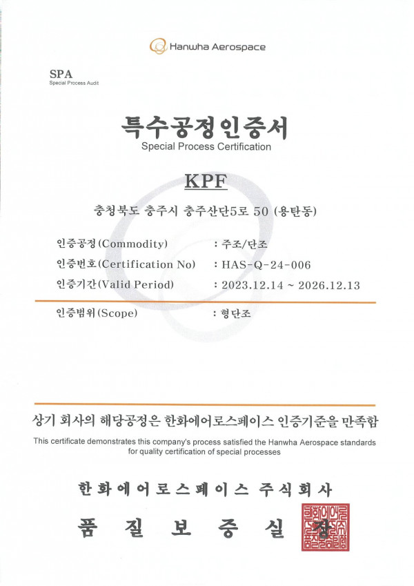 KPF는 2018년 한화에어로스페이스 (구 한화디펜스) 로부터 단조 공정에 대한 특수 공정 인증을 취득하였습니다.