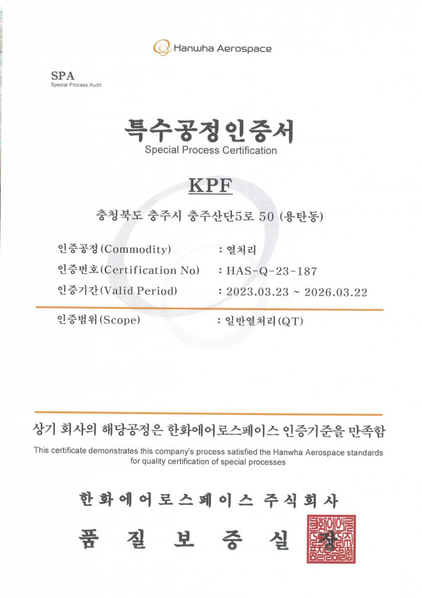 KPF는 2018년 한화에어로스페이스(구 한화디펜스)로부터 열처리 공정에 대한 특수 공정 인증을 취득하였습니다.